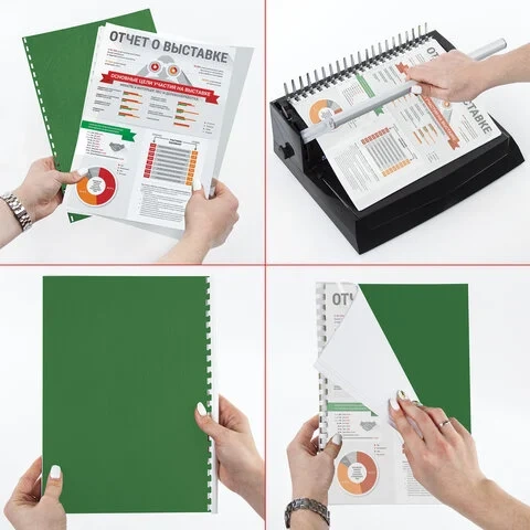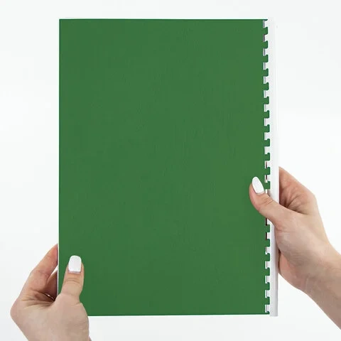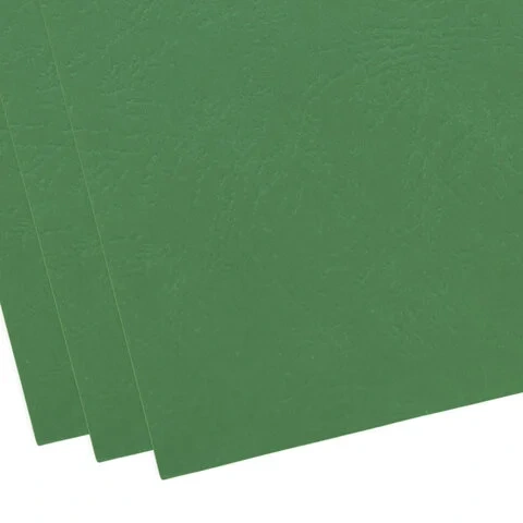 Выполнены из прочного, износостойкого картона зеленого цвета и плотностью 230 г/м2. Тиснение под кожу. Подходят для документов формата А4. 100 штук в комплекте.