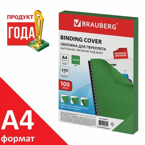 Обложки для переплета картонные Brauberg зеленые, А4, 230 г/кв.м, 100шт
