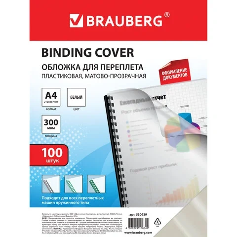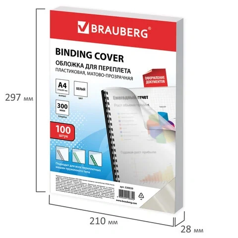 Обложки для переплета пластиковые Brauberg белые, А4, 300 мкм, 100шт