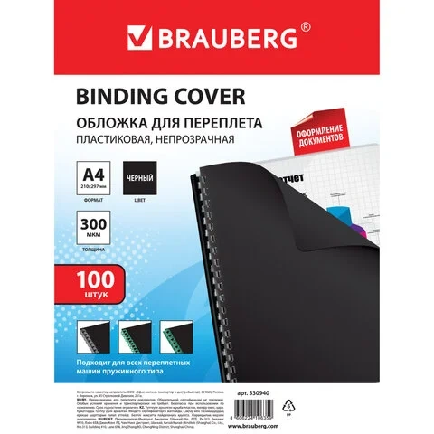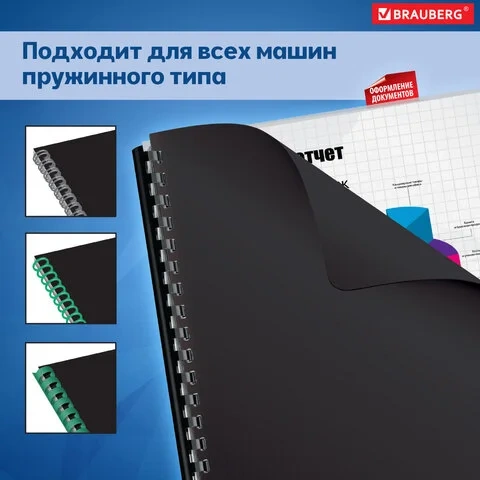 Обложки для переплета пластиковые Brauberg черные, А4, 300 мкм, 100шт