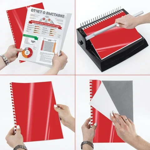 Выполнены из прочного, износостойкого полипропилена красного цвета и плотностью 300 мкм. Имеют глянцевую тектстуру. Подходят для документов формата А4. 100 штук в комплекте.