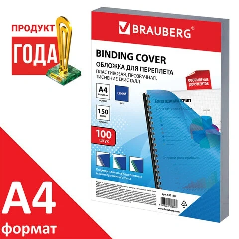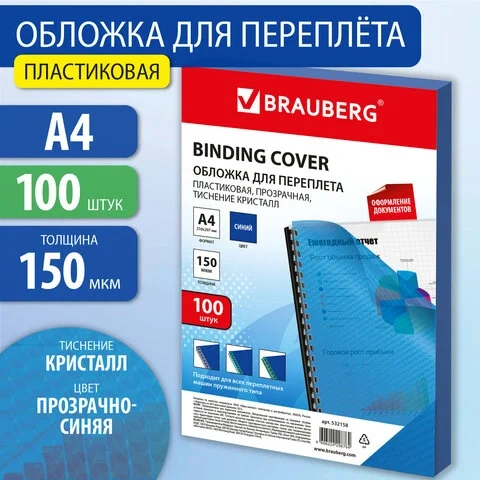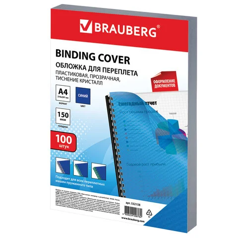 Обложки для переплета пластиковые Brauberg Кристалл прозрачно-синие, А4, 150мкм, 100шт/уп