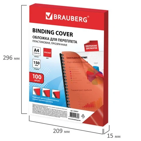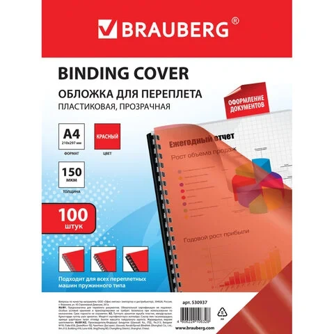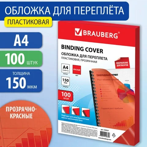 Обложки для переплета пластиковые Brauberg прозрачно-красные, А4, 150 мкм, 100шт