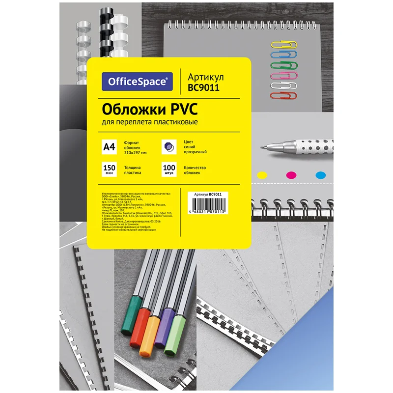 Обложки для переплета пластиковые Officespace PVC прозрачные синие, А4, 150мкм, 100шт