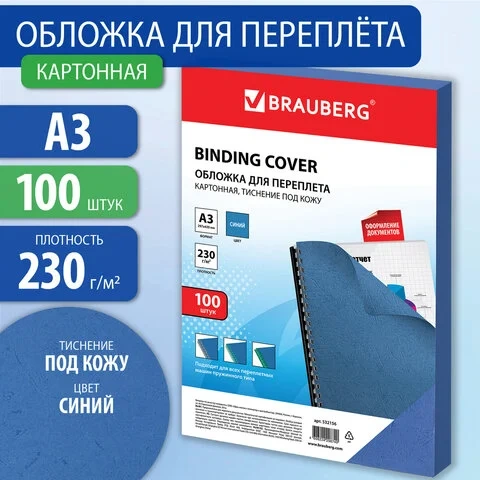 Обложки выполнены из прочного, износостойкого картона синего цвета плотностью 230 г/м2. Тиснение под кожу. Подходят для документов формата А3. 100 штук в комплекте.