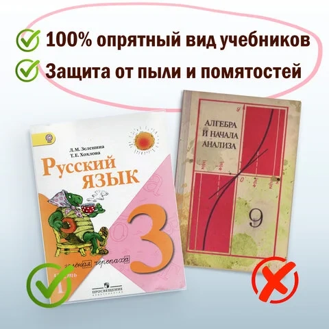 Прозрачная глянцевая плотная обложка для учебников младших классов изготовлена из полипропилена (ПП) толщиной 70 мкм. Благодаря КЛЕЙКОМУ КРАЮ обложка легко регулируется по ширине. Размер - 265х450 мм. С индивидуальным штрих-кодом. В комплекте 5 штук.