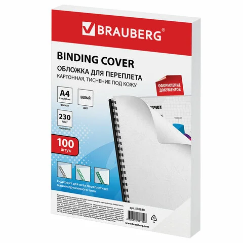 Обложки для переплета картонные Brauberg белые, А4, 230 г/кв.м, 100шт
