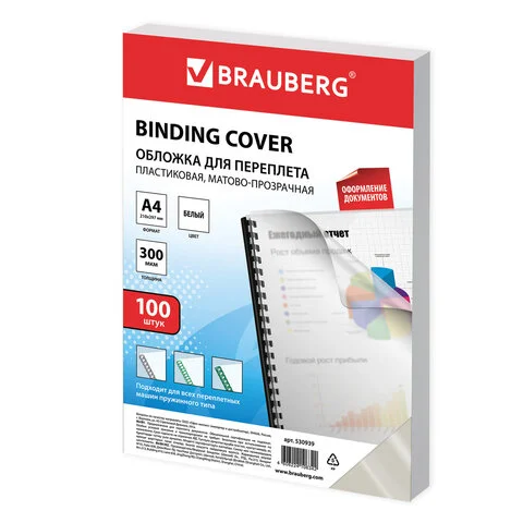 Обложки для переплета пластиковые Brauberg белые, А4, 300 мкм, 100шт