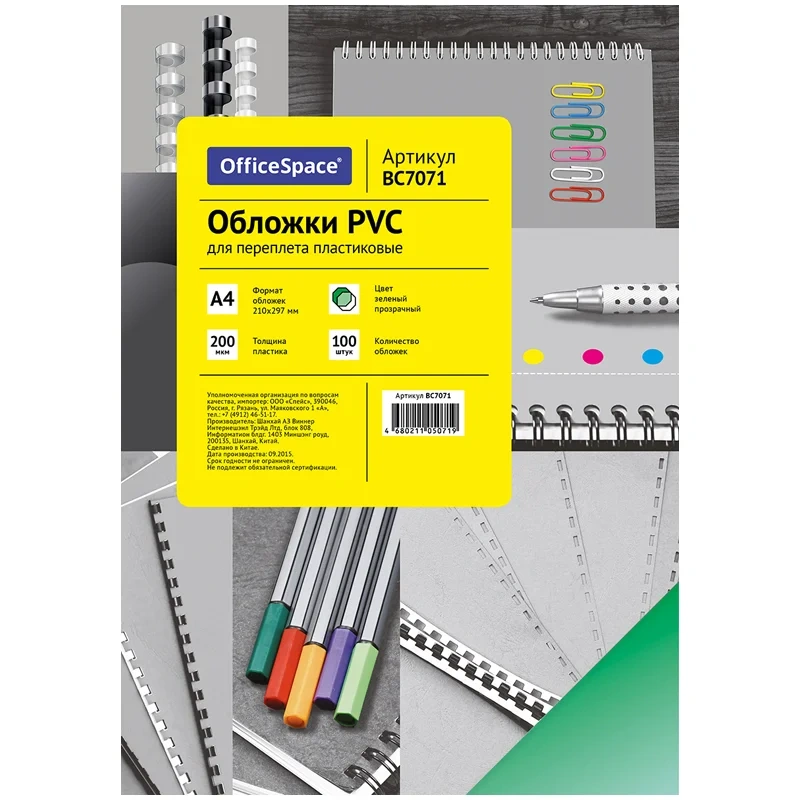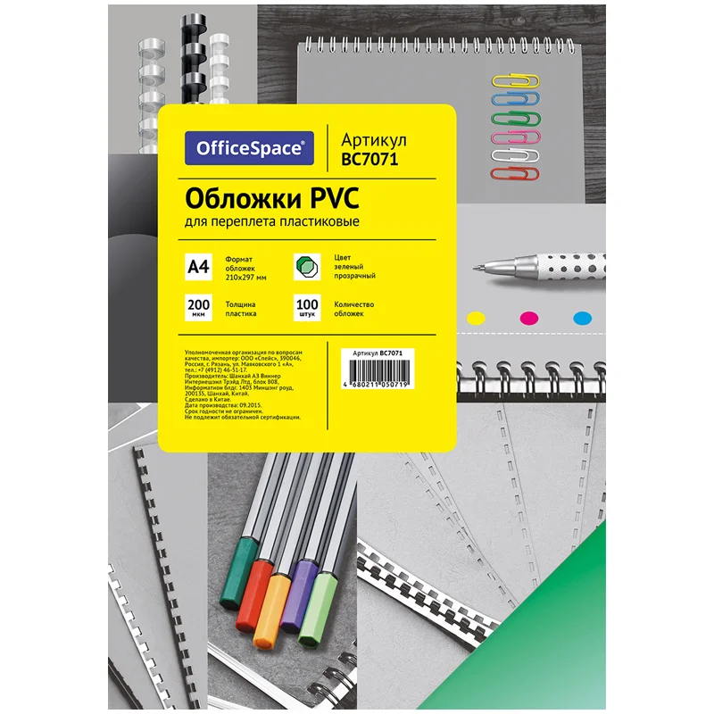 Обложки для переплета пластиковые Officespace PVC прозрачные зеленые, А4, 200мкм, 100шт