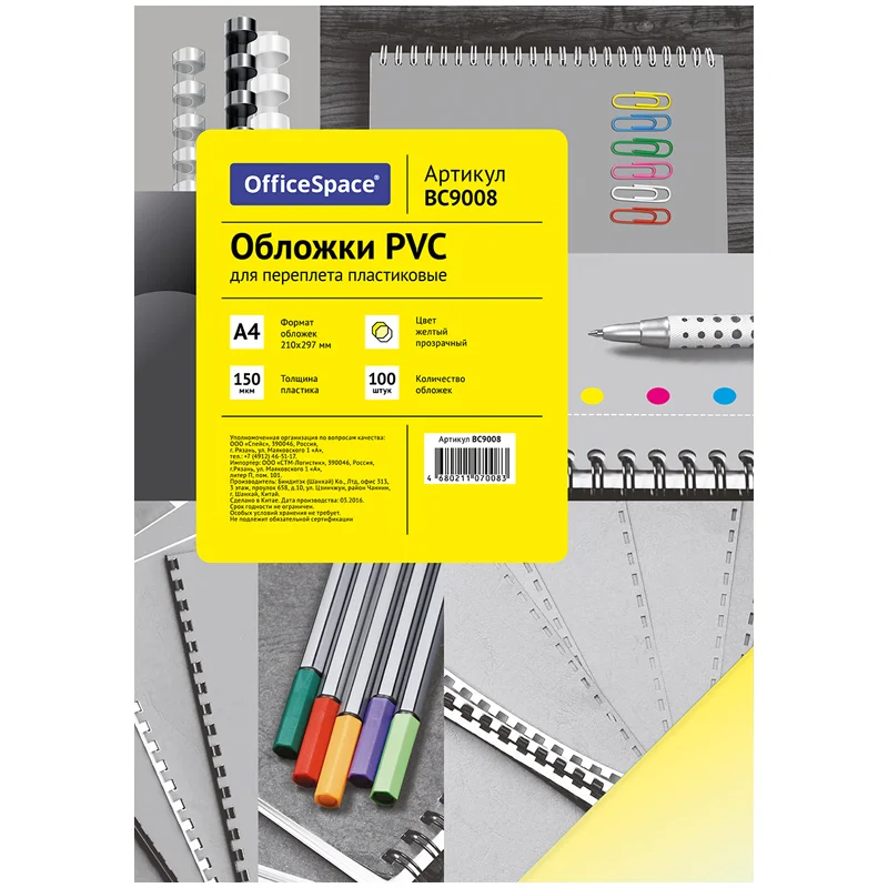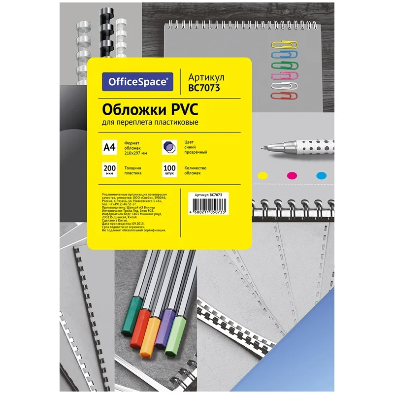 Обложки для переплета пластиковые Officespace прозрачные желтые, А4, 150мкм, 100шт