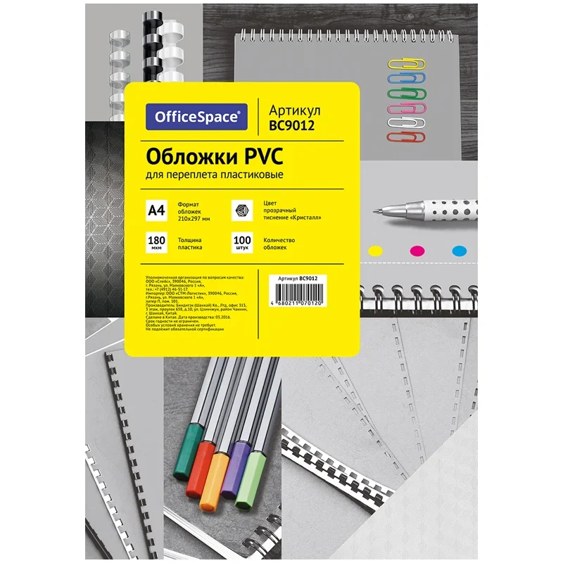 Обложки для переплета пластиковые Officespace Кристалл прозрачные, А4, 180мкм, 100шт