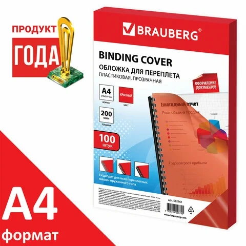 Обложки для переплета пластиковые Brauberg прозрачно-красные, А4, 200 мкм, 100шт,532161