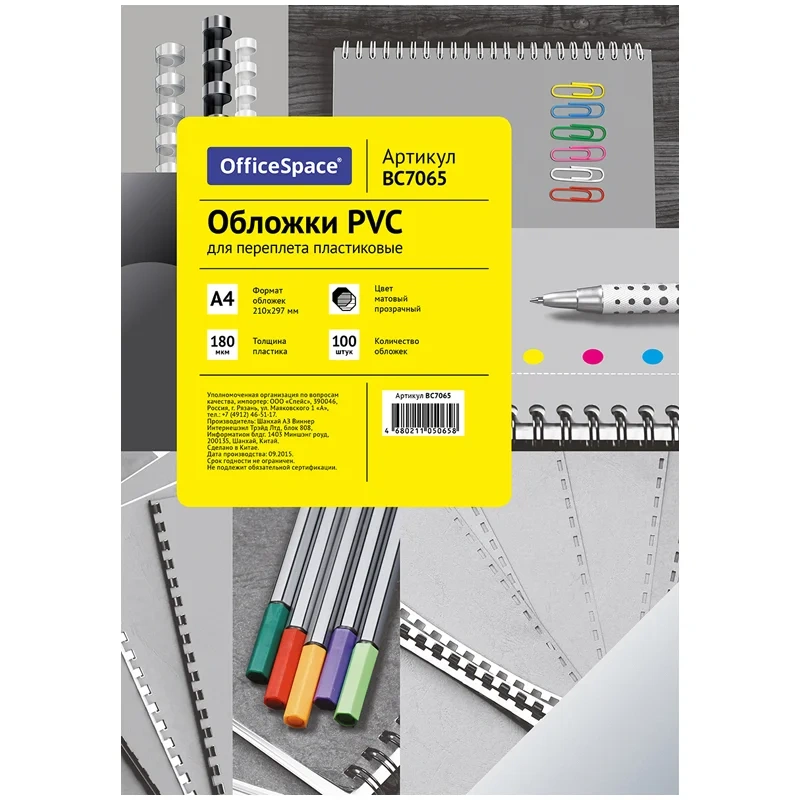 Обложки для переплета пластиковые Officespace PVC прозрачные матовые, А4, 180мкм, 100шт