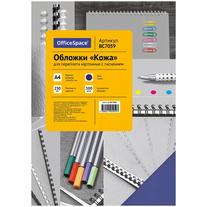 Обложки для переплета картонные Officespace Кожа синие, А4, 230г/кв.м, 100шт