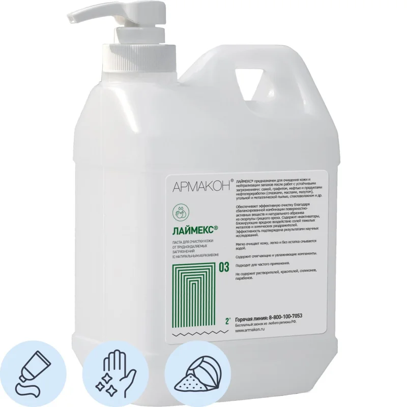 Очищающая паста Армакон Лаймекс- паста для очистки кожи от трудноудаляемых загрязнений (с натуральным абразивом). Предназначена для очищения кожи от нефтепродуктов, масел, металлической пыли, графита, смазочных веществ, масляных красок, битума, сажи и т. п. Обеспечивает бережное и эффективное очищение кожи благодаря сбалансированной комбинации ПАВ и натурального абразива. В качестве абразива используется мука из измельченной скорлупы грецкого ореха, изготовленный с использованием современной вакуумной технологии, исключающей образование острых частиц. Входящие в состав пасты алюмосиликат магния и ксантановая камедь эффективно адсорбируют трудносмываемые загрязнения и облегчают их удаление. Паста содержит инактиваторы, нейтрализующие вредное воздействие солей тяжелых металлов и химических раздражителей. Ухаживающий комплекс из растительного масла, олеиновой кислоты и касторового масла эффективно смягчают и увлажняют кожу. Удаляет неприятные запахи с кожи, легко и без остатка смывается водой. Подходит для частого применения. Состав соответствует требованиям регламента ЕС № 1223/2009 от 30 ноября 2009 г. Не содержит растворителей, красителей, силиконов и парабенов. Упаковка: канистра с дозирующей насадкой 2000 мл. Условия хранения: избегать попадания прямых солнечных лучей. Данный товар может храниться при отрицательной температуре без потери своих свойств (выдерживает 3 цикла заморозки до −50 °C). Срок годности от даты изготовления 24 месяца. Соответствует стандартам ТР ТС 019/2011, ГОСТ 31696-2012.
