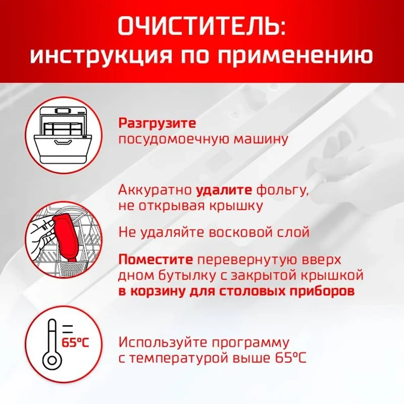 Способ применения: разгрузите посудомоечную машину. Аккуратно удалите фольгу, не открывая крышку. Восковой слой оставьте нетронутым. Поместите перевернутую вверх дном бутылку с закрытой крышкой в корзину для столовых приборов. Используйте программу с температурой 65°C − 75°C. Рекомендации: используйте интенсивное чистящее средство Somat для посудомоечных машин не реже 1 раза в 3 месяца.
