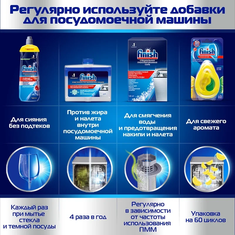 Назначение: очиститель для посудомоечных машин Finish удаляет жир и известковый налет в посудомоечной машине, и ваша посуда буквально сияет чистотой. Обеспечивает поддержание работы посудомоечной машины: устранение накипи; очищение от жира; очищение труднодоступных деталей посудомоечной машины; нейтрализация неприятного запаха.