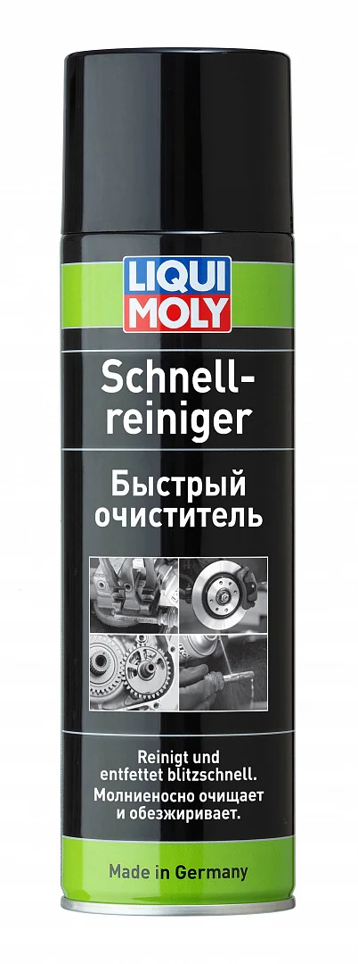 Для быстрого обезжиривания и очистки различных деталей автомобиля. Используется для очистки от масляных и жировых загрязнений деталей тормозной системы, коробки передач, сцепления и т. п. Быстро испаряется, не оставляет следов. Хорошо удаляет остатки смол и смазок. Обладает отличным проникающим действием. Не оставляет следов. Не содержит ацетона и хлора. Аэрозоль, содержит легкий лигроин (гидрированная низкокипящая нефтяная фракция). Обладает слабым техническим запахом и очень быстро испаряется. Удаляет загрязнения за счет растворения и за счет сильного механического воздействия струи аэрозоля. Газ-вытеснитель СО2 обеспечивает остронаправленную струю препарата, исключающую необходимость использования длинной распыляющей трубочки. - Высокая проникающая способность; - Быстрое и без остаточное испарение; - Растворяет смолообразные и дегтеобразные остатки; - Устраняет загрязнения из масла и густой смазки; - Высокий удельный вес активных веществ; - Абсолютно не содержит хлора и ацетона; - Не воздействует на окружающую среду; - Экономичен и универсален в применении. Использование Schnell-Reiniger позволяет быстро и эффективно устранить загрязнения на различных деталях, существенно облегчая процесс очистки и экономя время. Обработать очистителем загрязненные поверхности и дать ему стечь. После высыхания очистителя детали и поверхности становятся чистыми и обезжиренными. Внимание! Очиститель может повредить пластиковые детали и лакированные поверхности, поэтому предварительно рекомендуется проверить его на совместимость с ними.