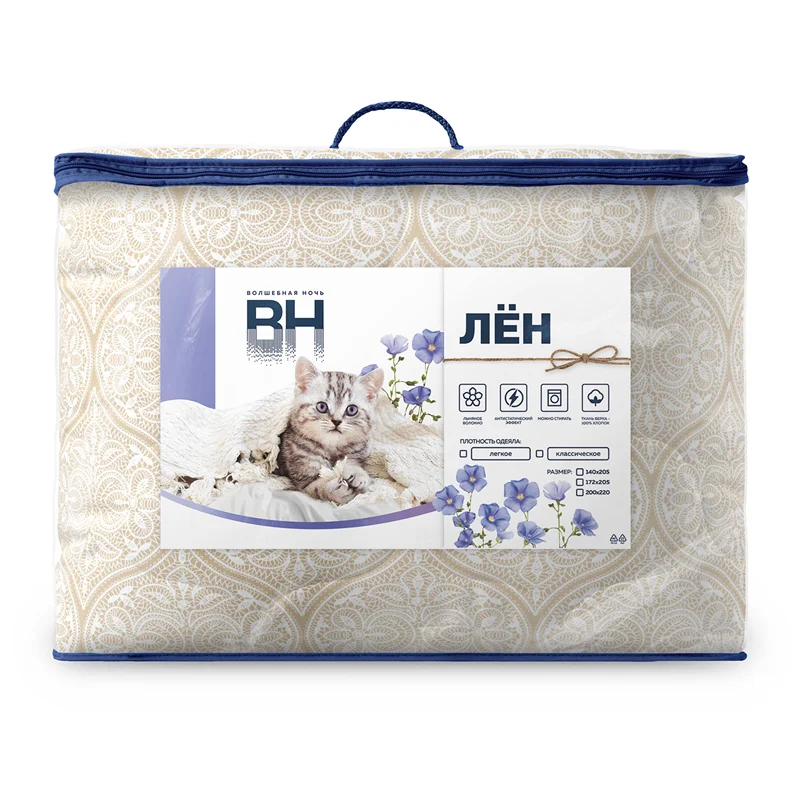 Одеяло Волшебная ночь Лен 70% полиэстер 30%, 200 x 220см - натуральные льняные компоненты коллекции одеял Лен придают изделиям тонкий приятный аромат свежего сена, а упругость волокон не дает им потерять форму. Изделия этой коллекции обладают прекрасной терморегуляцией, что позволит не замерзнуть промозглыми зимними ночами и не испытывать жары в теплые периоды года. Одеяла из этой коллекции сохранят Ваш комфортный сон вне зависимости от температуры за окном. Это идеальное сочетание натуральных материалов с полезными свойствами синтетического наполнителя, гарантирующего практичность, износостойкость, долговечность изделия и простоту ухода. Облегченное одеяло с натуральным льняным волокном очень легкое, тонкое, отлично подходит для теплого времени года или хорошо отапливаемых помещений, обладает бактерицидными свойствами, высокой степенью воздухопроницаемости, не теряет форму, в отличие от пуховых одеял. Льняное одеяло не электризуется, устраняет негативное воздействие бытовой техники, способствует профилактике кожных болезней, дерматитов, раздражений, подходит людям с астмой. Наполнители из натурального льняного волокна содержат 70% льняного волокна и 30% искусственного наполнителя (волокна полиэстера). Такой вид наполнителя позволяет дышать телу во время сна, защищает от образования бактерий, обладает превосходной терморегуляций и не электризуется. Специальные технологии обработки льна позволяют получить высокое качество наполнителей для подушек и одеял. Высококачественный наполнитель обрамлен в чехлы из 100% хлопка, придавая изделиям невероятную мягкость и приятные тактильные ощущения. Предназначено для тепловой защиты и сохранения тепла во время сна или отдыха в спальне.