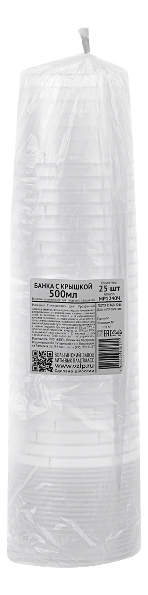 Банка Vzlp с крышкой пластиковая прозрачная 500мл, 25шт