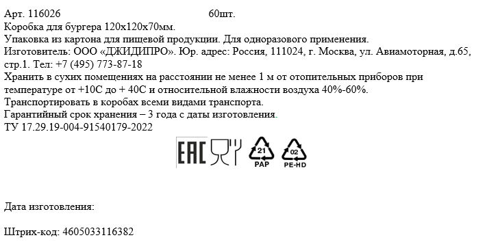 Коробка для бургера картонная 12 x 12 x 7см, 60шт