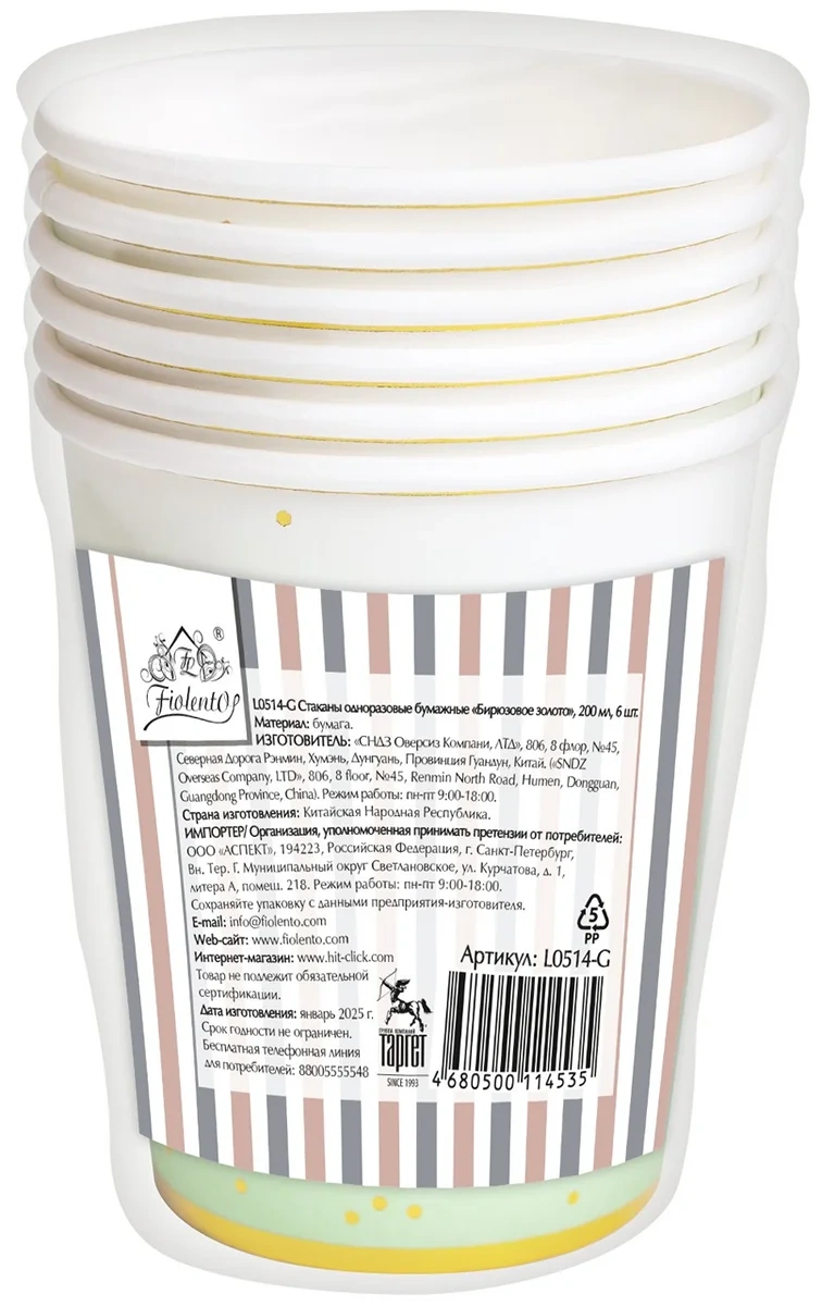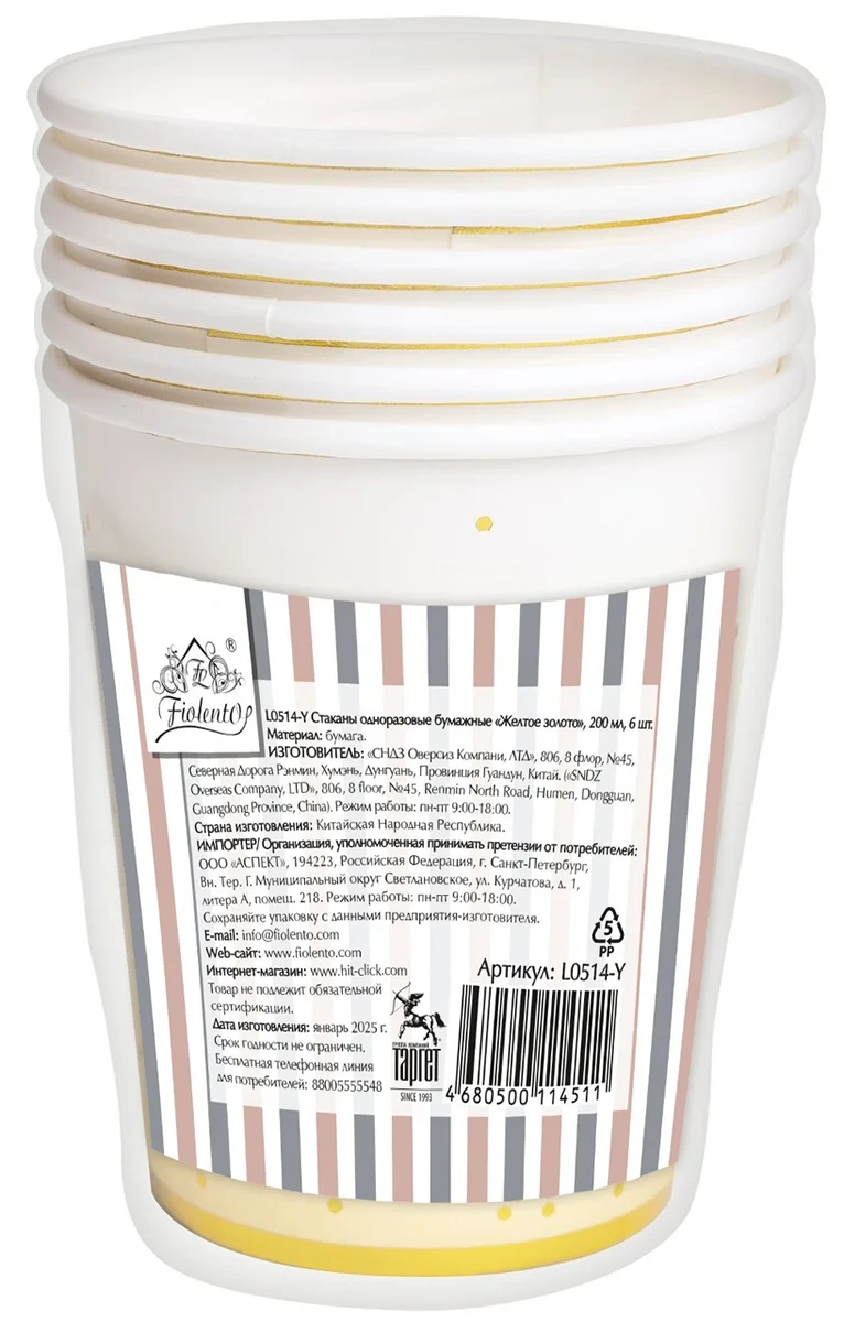 Стакан одноразовый Fiolento бумажный желтое золото 200мл, 6шт