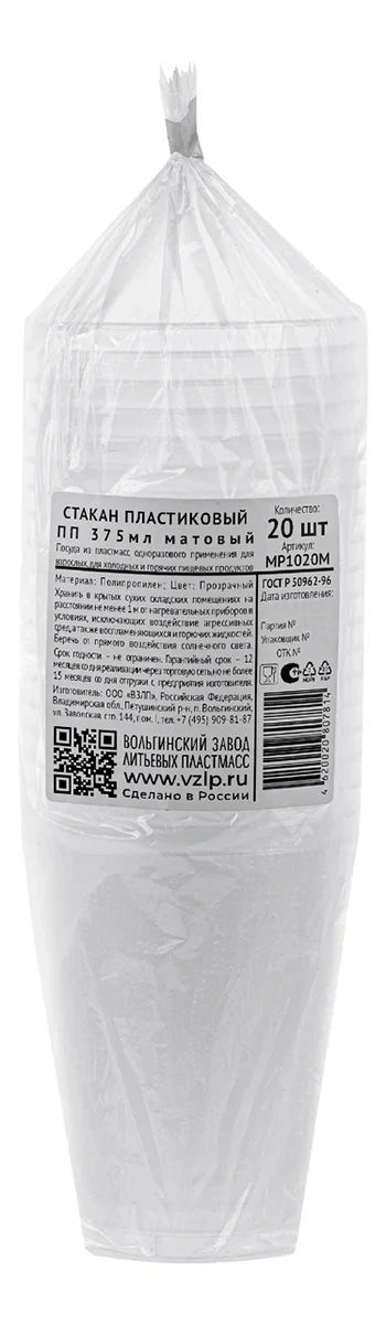 Стакан одноразовый Vzlp матовый пластиковый прозрачный 375мл, 20шт
