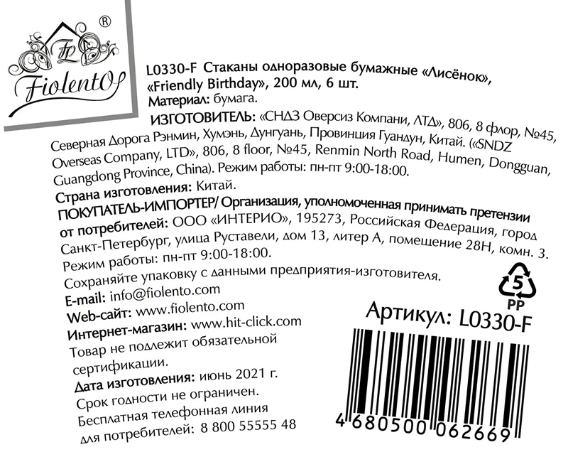 Стакан одноразовый Fiolento Лисенок бумажный разноцветный 200мл, 6шт