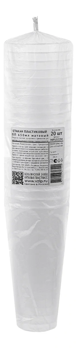 Стакан одноразовый Vzlp матовый пластиковый прозрачный 650мл, 20шт