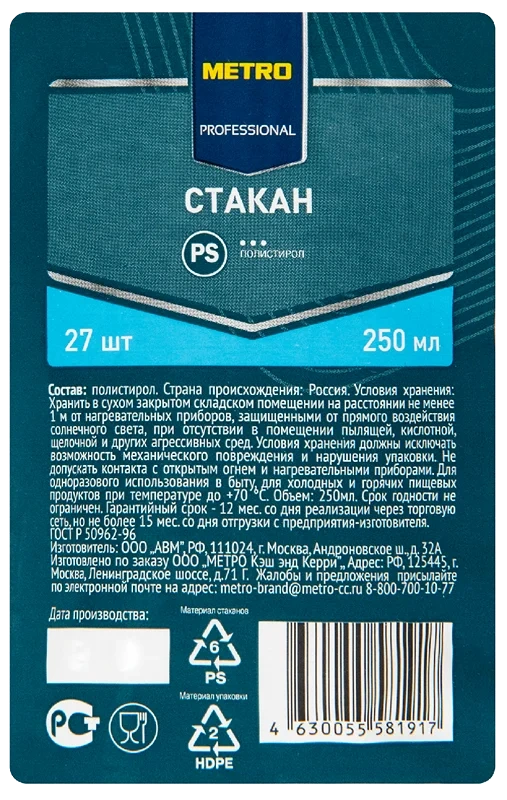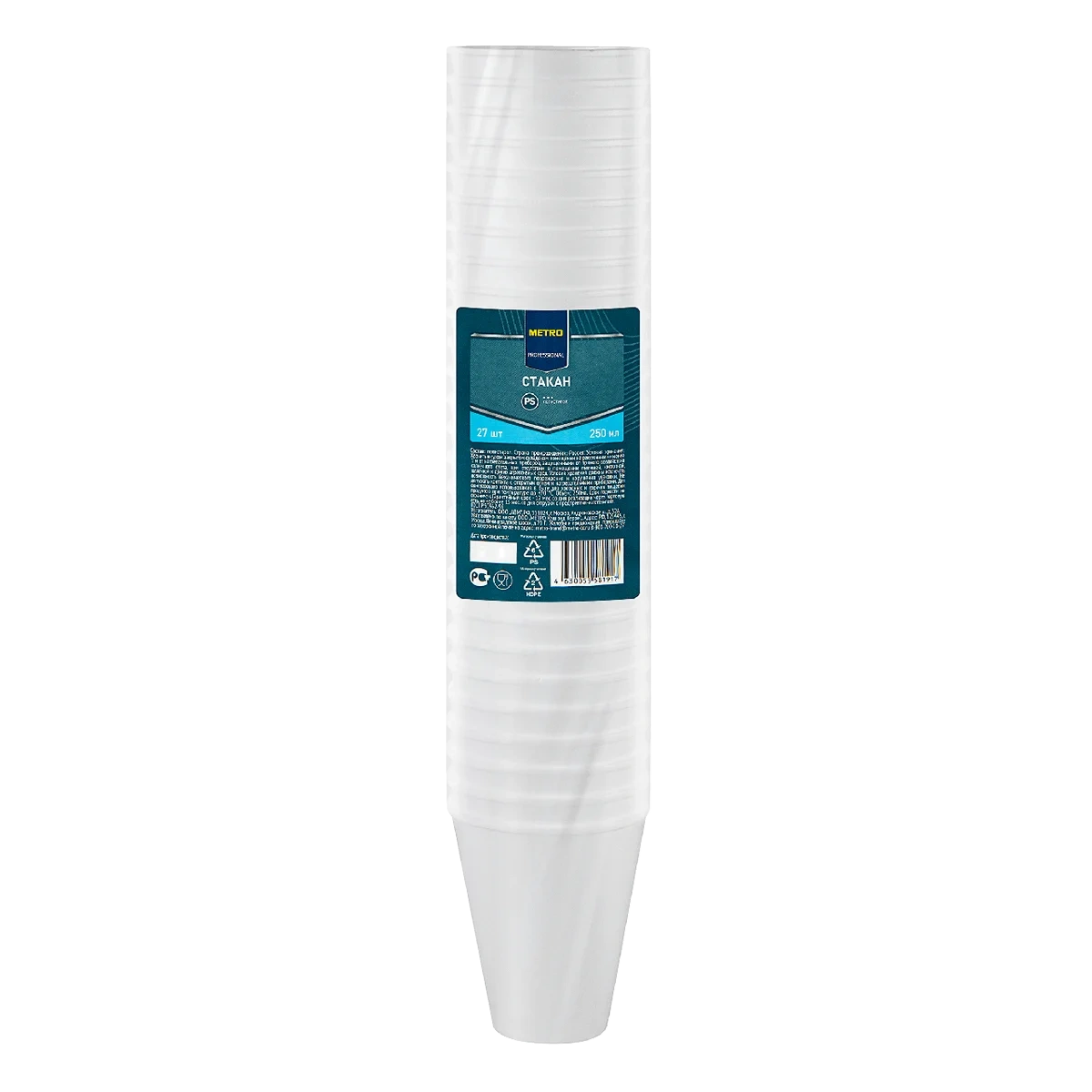 Стакан одноразовый Metro Professional белый, пластиковый, 250мл, 27шт