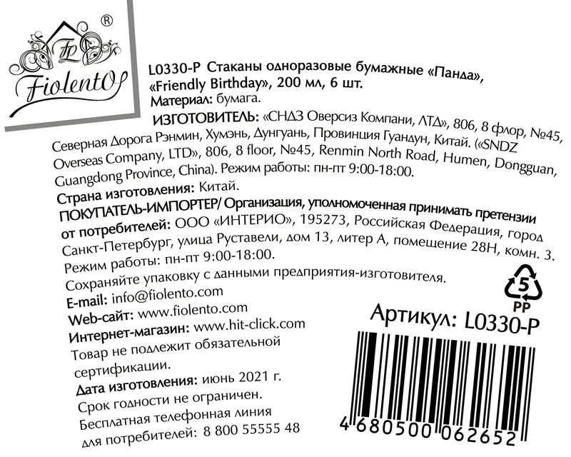 Стакан одноразовый Fiolento Панда бумажный разноцветный 200мл, 6шт