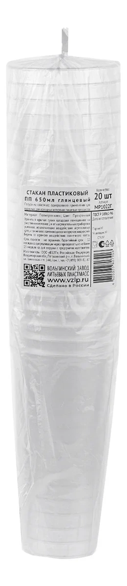 Стакан одноразовый Vzlp глянцевый пластиковый прозрачный 650мл, 20шт