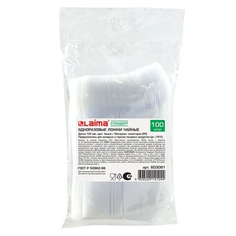 Ложка одноразовая чайная Laima Стандарт белая, 12.5см, 100шт/уп