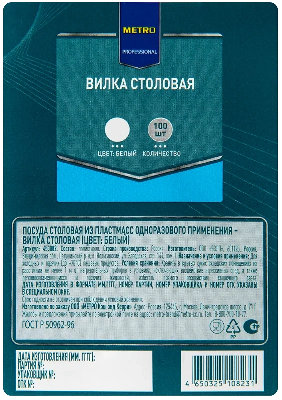 Вилка одноразовая Metro Professional 16.5см, белая, 100шт/уп