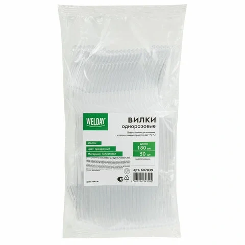 Вилка одноразовая Welday прозрачная, 18см, 50шт/уп