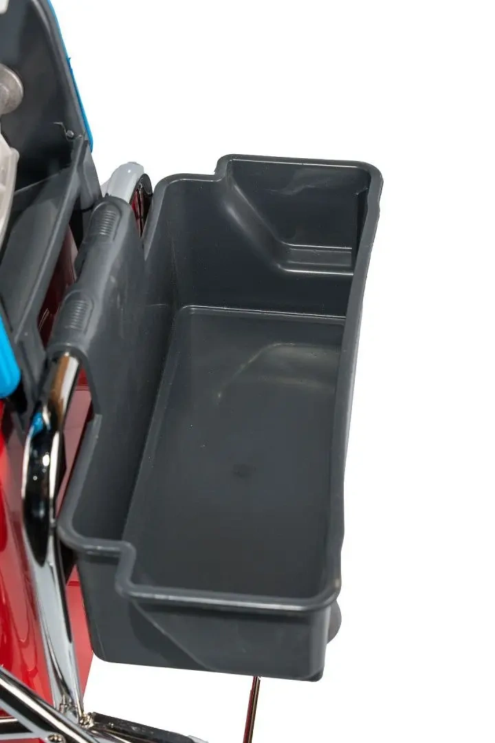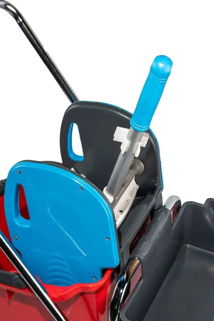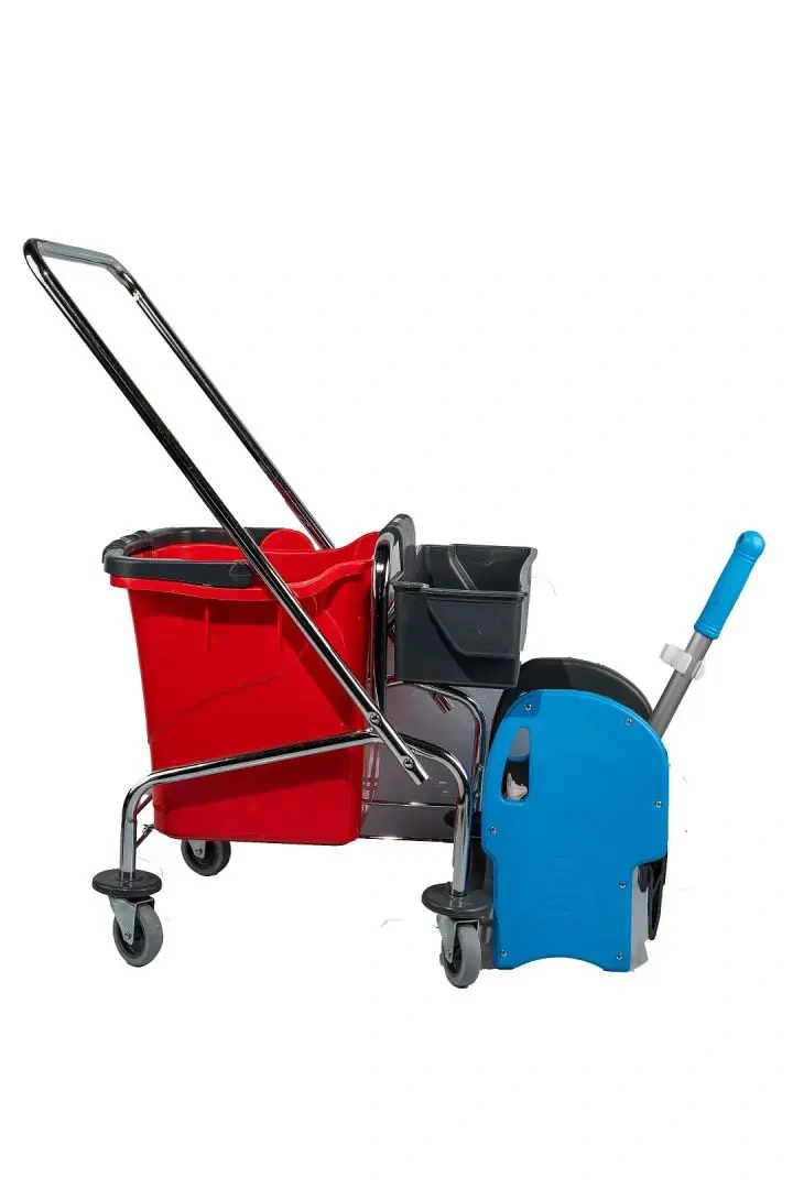 Тележка TK720 ,объем ведра 25 л. Базовая рама выполнена из хромированного металла, ведро - из качественного пластика. Оснащена удобной ручкой. 4 колеса обеспечивают тележке маневренность. К тележке прикреплена удобная корзинка для хранения бытовых средств и мелких аксессуаров, необходимых в уборке.