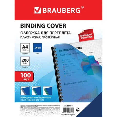 Обложки для переплета пластиковые Brauberg прозрачно-синие, А4, 200 мкм, 100шт