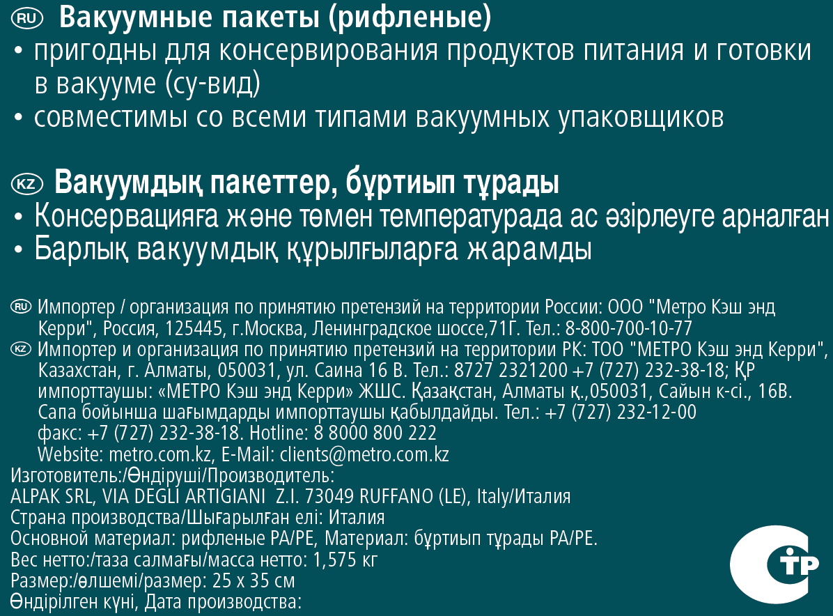 Пакет для вакуумной упаковки Metro Professional 25х35см, рифленый, 100шт/уп