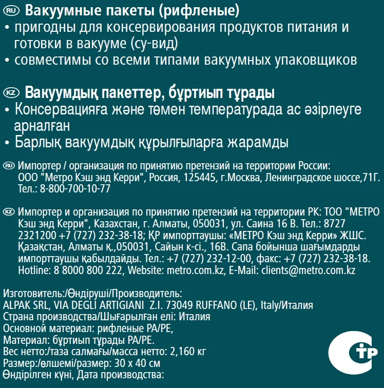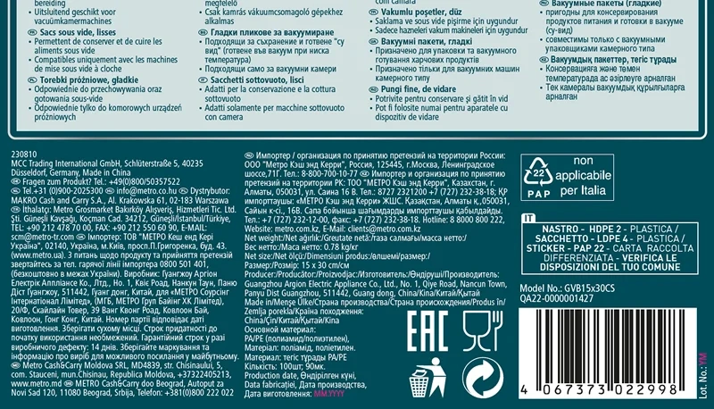 Пакет для вакуумной упаковки Metro Professional 15х30см, 100шт/уп