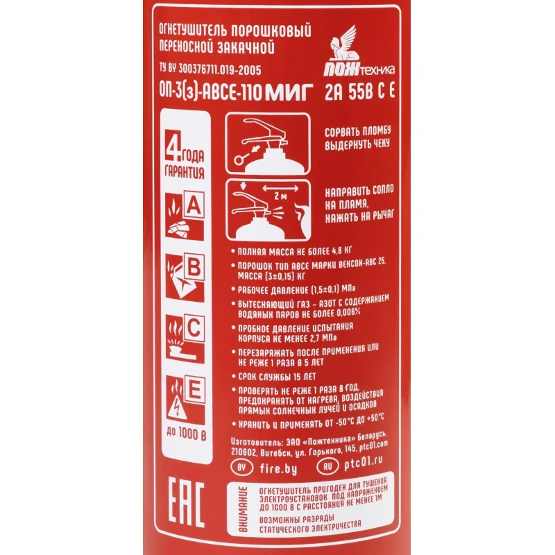 Паспорт баллона нанесен заводским клеймением по ТР ЕАЭС 032/2013. Гарантийный срок составляет 48 месяцев, срок службы огнетушителя −15 лет. Производитель: Пожтехника, Беларусь. Огнетушитель соответствует стандарту ГОСТ Р 51057-2001.