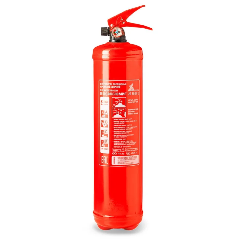 Огнетушитель порошковый ОП-3(з) «Миг» ABCE — портативное средство для тушения твердых веществ, жидкостей, газов и электрооборудования под напряжением до 100 В. Он предназначен для использования в общественных зданиях и на автотранспорте, включая автобусы и грузовые автомобили. Рабочий температурный диапазон составляет от −50°С до 50°С.