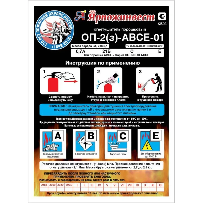 Масса заряда огнетушащего вещества - 2 кг. Ранг по модельным очагам: 0,7А, 21В, С, Е (до 1000В).