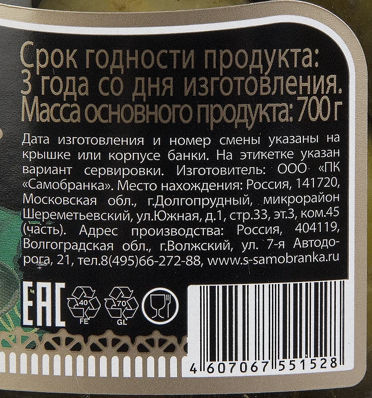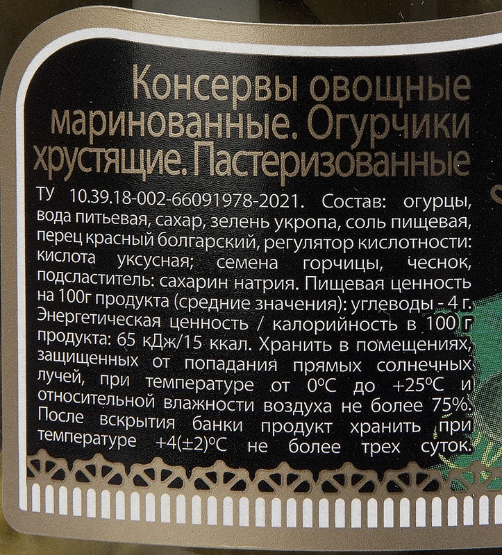 огурцы (до 9 см), вода, уксус, соль, сахар, укроп, желтая горчица, лук, черный перец, хлорид кальция