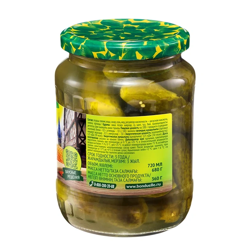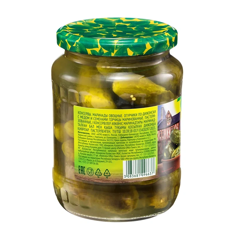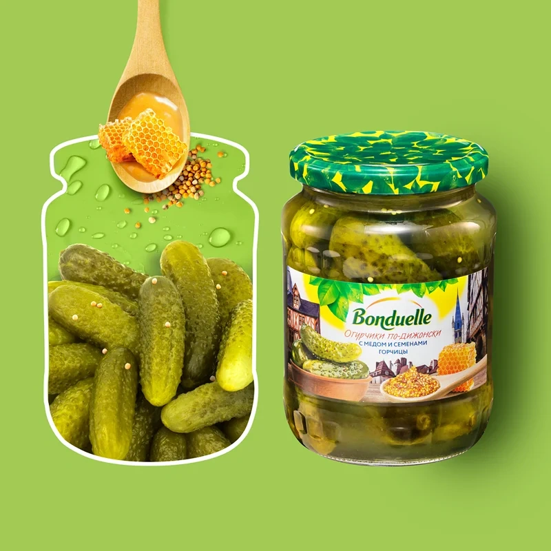 Новый продукт Бондюэль Огурцы по-дижонски с медом и семенами горчицы- такого вкуса вы не найдете больше нигде. Эти огурцы не простые - они с французским характером. Изысканные, с игривым вкусом и влюбляющие в себя безоговорочно. Семена дижонской горчицы подарили огурцам легкую остроту и пряность, а мед - нежную сладость. Подавайте к мясу или к овощам, добавьте в салат. Даже самые привычные блюда с этими огурчиками раскроются с незнакомой для вас стороны.