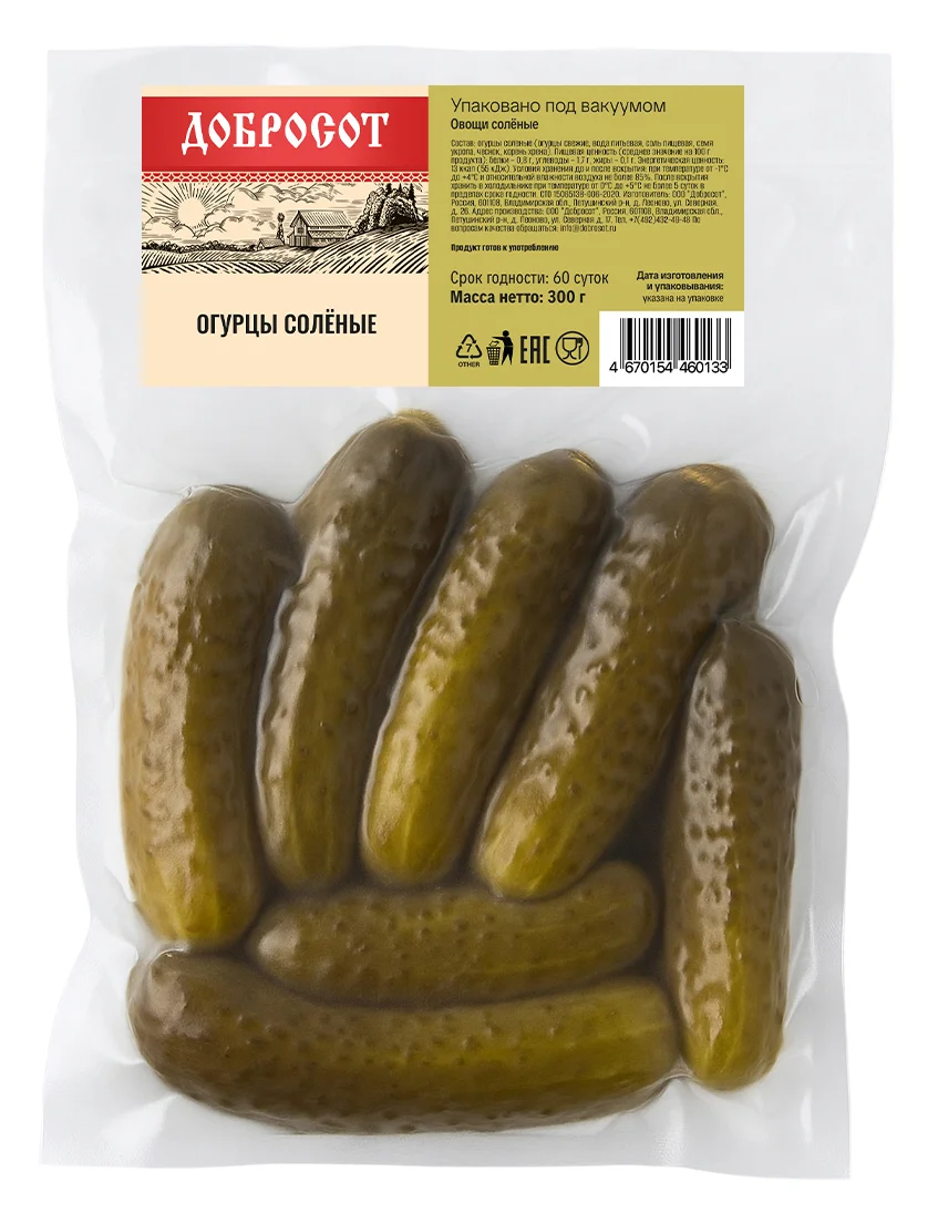 Огурцы соленые (свежие огурцы, вода питьевая, соль пищевая, семя укропа, чеснок, корень хрена).