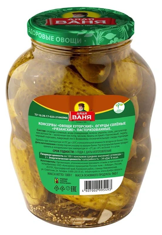Огурцы Дядя Ваня соленые рязанские, 1.8кг — традиционное блюдо славянской кухни. Такие огурчики можно подавать к самым разнообразным блюдам: жареному картофелю, рису, омлету или жаркому. Плоды обладают плотной, но тонкой кожей, а в мякоти нет пустот. Соленые огурцы добавляют в овощные салаты, азу, суп, рассольник и различных холодные закуски. Засоленные огурцы — один из основных ингредиентов для различных бургеров и сэндвичей. Плоды приготовлены по оригинальному рецепту и сдобрены душистыми приправами. Продукт характеризуется высоким качеством и соответствует установленным стандартам. Огурцы отлично сочетаются с другими овощами и мясом и подходят как для повседневного, так и для праздничного стола.