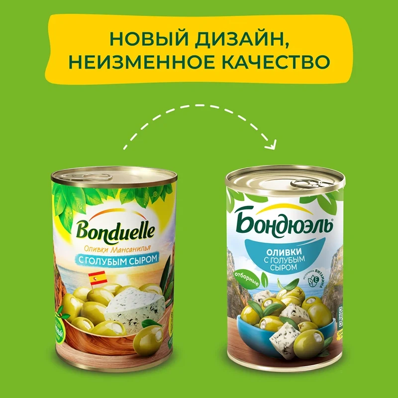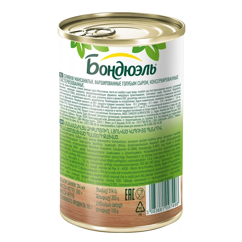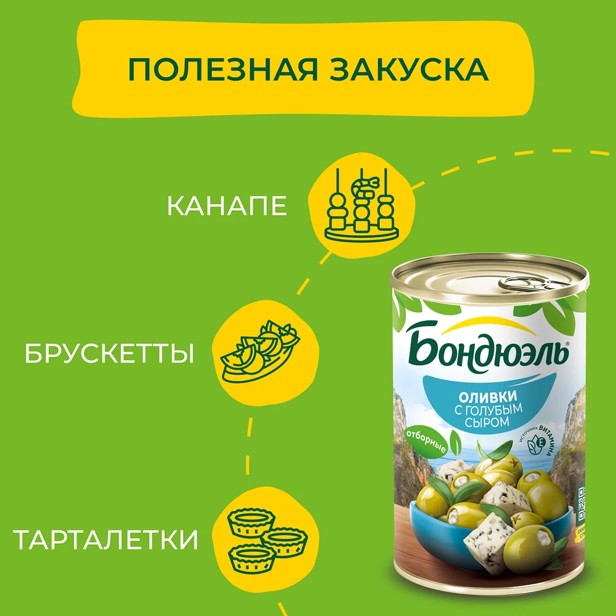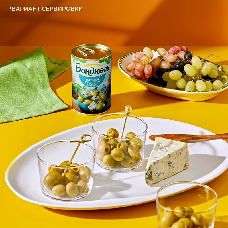 Гурманам посвящается новый продукт Бондюэль - оливки, фаршированные голубым сыром. Выращенные в испанской Андалусии, крупные, очень сочные оливки сорта Мансанилья обрели французский шарм. Слаженный дуэт представителей кулинарии разных стран прекрасен как закуска. Они станут хорошим аккомпанементом к блюдам из мяса или из птицы. Положите несколько оливок на сырную тарелку - это будет восхитительное сочетание.