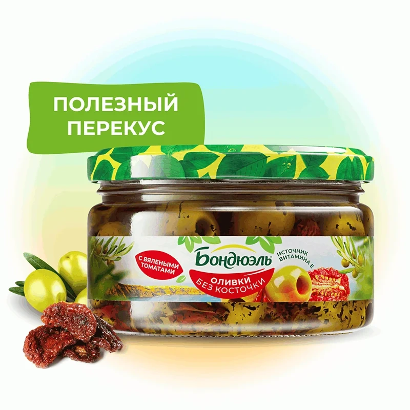 Бондюэль предлагает новинку - зеленые оливки с вялеными томатами в стеклянной баночке 250мл, чтобы добавить яркости и вкуса вашему рациону. А еще они 100% натуральные, богаты витамином Е, омегой и жирами.