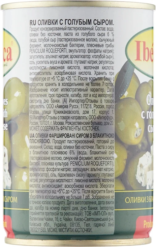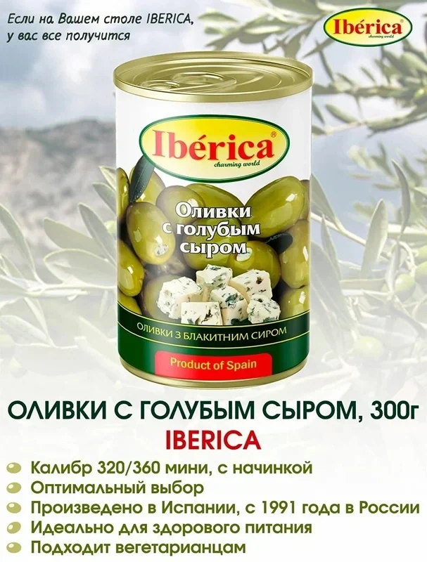 Оливки Iberica фаршированные голубым сыром станут изысканным дополнением к блюдам из мяса или из птицы, украсят сырную тарелку и салат. Необычное сочетание отборных плодов и сыра с плесенью порадует гурманов.