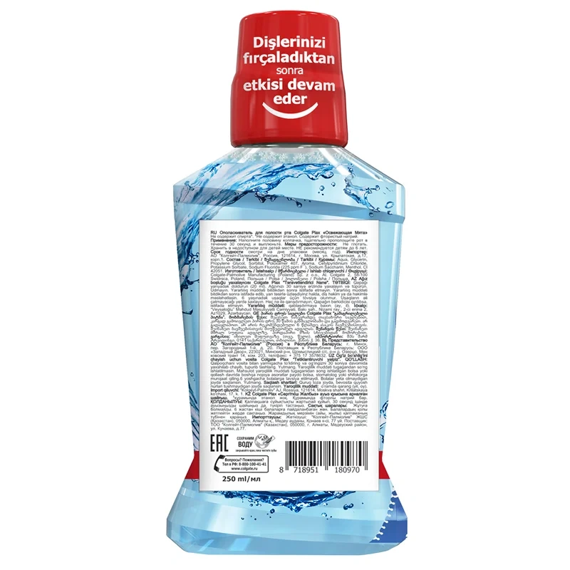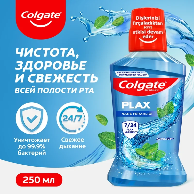 Незаменимое средство для комплексного ухода за полостью рта. Способен проникнуть даже в самые труднодоступные места и смыть зубной налет, мелкие остатки пищи, часть микробов. Он создает защитную пленку, нейтрализующую негативное воздействие вредных бактерий. Используйте его дважды в день – и ваше дыхание будет свежим 24 часа/7 дней в неделю. Обладает приятным мятным вкусом. Уникальная формула без спирта не вызывает жжения в полости рта. Ополаскиватели Colgate Plax способствуют снижению риска возникновения кариеса, удаляют зубной налет, помогают предотвратить воспаление десен, освежают и дарят уверенность в себе. Это важный элемент полноценного ухода за полостью рта. Используйте два раза в день после чистки зубов, чтобы очистить труднодоступные участки полости рта. Подарите себе здоровье, которое вы заслуживаете. Значительно уменьшает зубной налет. Защищает от проблем десен. Содержит фтор для борьбы с кариесом.